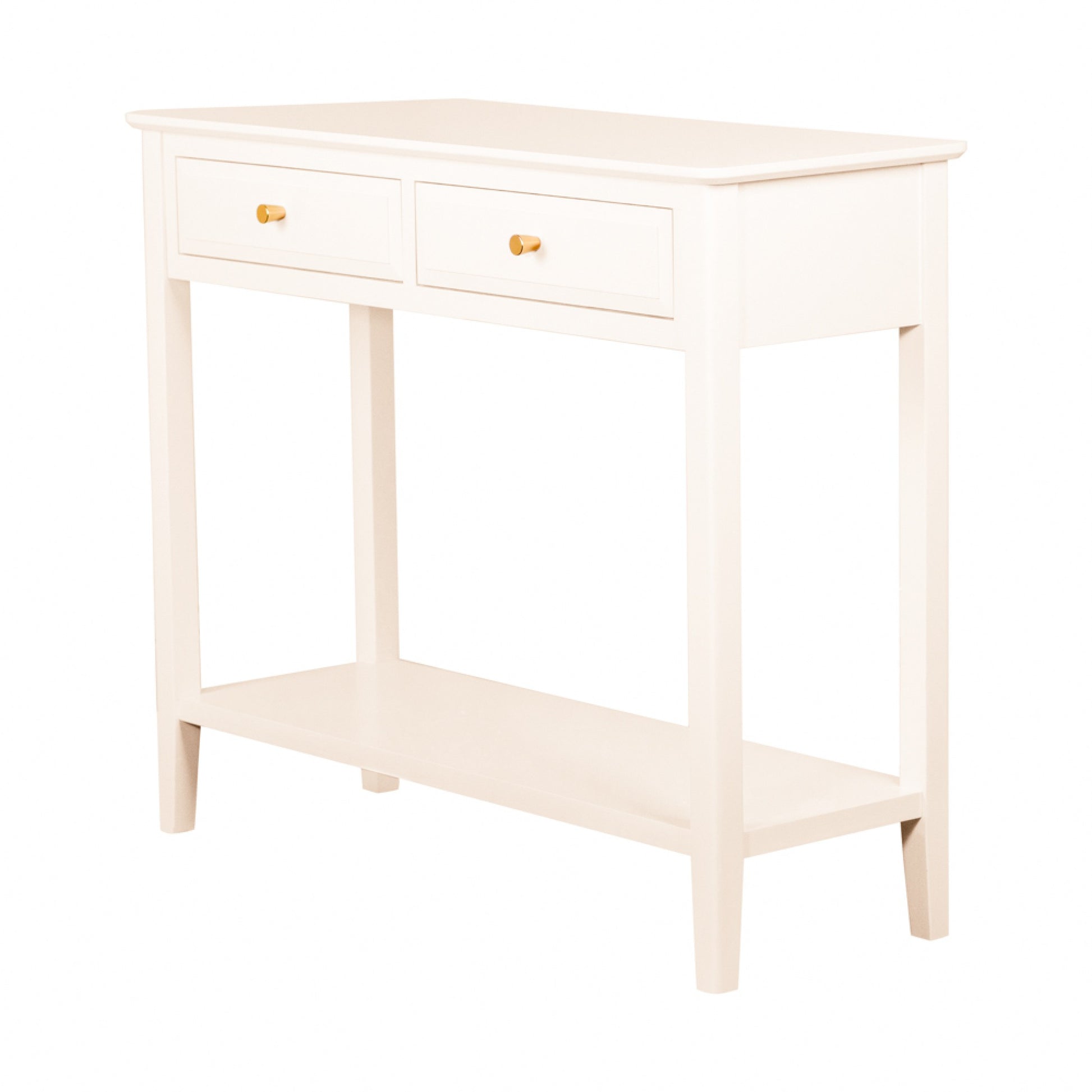 - Smart pale cream painted finish - Two drawers with raised beading around the edge and matt gold metal handles - Handy lower shelf for storage and display - Square legs - Ergonomic chamfered corners on the top - Minimal assembly required