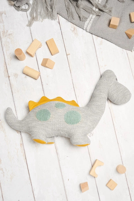 Our large knitted organic cotton Diplodocus dinosaur toy is made from tactile organic cotton. Soft grey with raised teal spots and mustard spikes. This gorgeous large Diplodocus toy is part of a range of Scandi toys.